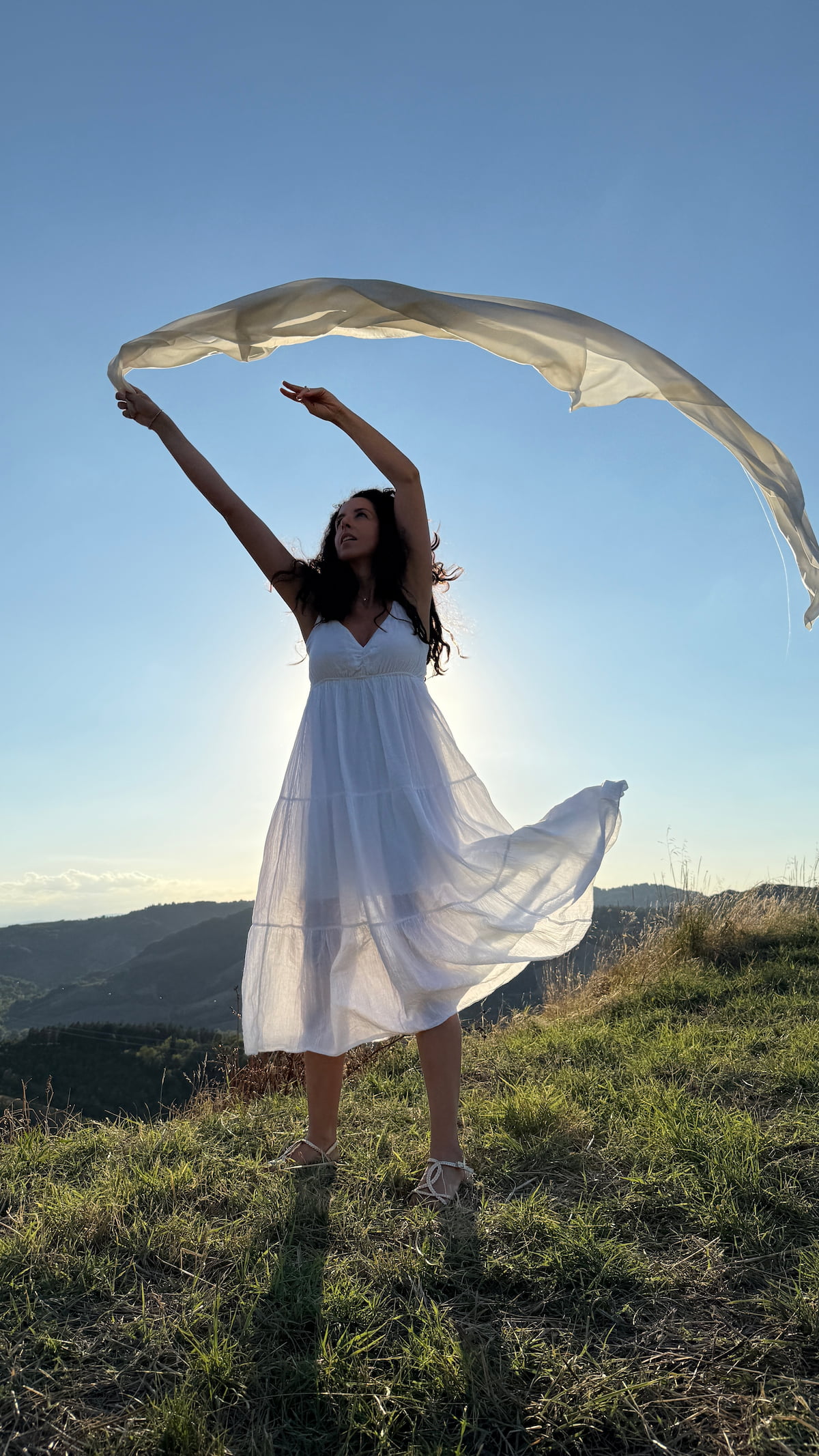 Per questa foto per la copertina del libro di Michela, abbiamo quindi scelto una location con un punto di vista panoramico, capace di amplificare il senso di apertura e profondità, valorizzato da un tramonto intenso e suggestivo.