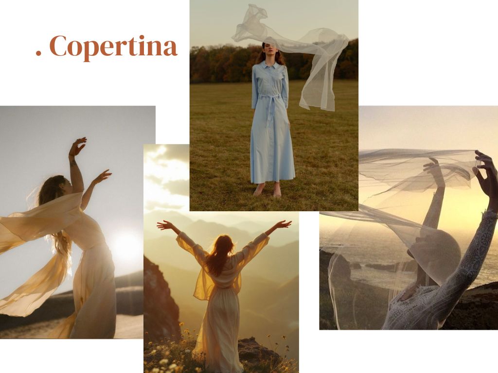 Per rafforzare visivamente questo messaggio, abbiamo lavorato con un tessuto leggero, che ci ha permesso di costruire movimento e dare forma all’idea di leggerezza.
